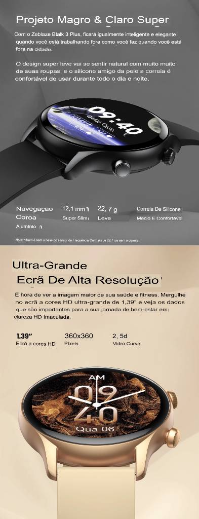? Tela de alta resolução de 1.39 inch ?Na tela colorida HD de 1,39 ", a tela do Zeblaze Btalk 3 Plus é aprimorada em tamanho, vibração e resolução. Curvado para parecer natural em seu pulso, a tela é feita de vidro temperado que é coberto com um revestimento anti-impressão digital. Aproveite uma tela maior e um estilo mais inteligente.