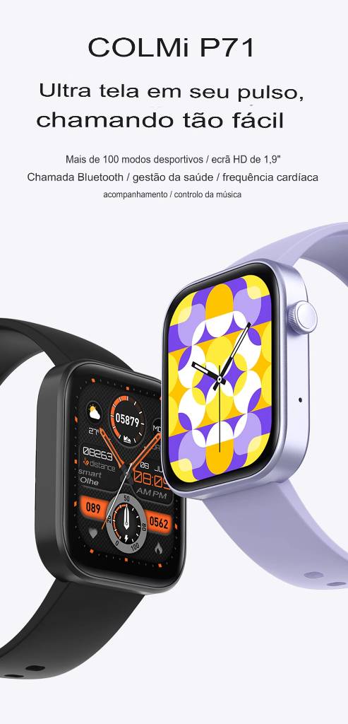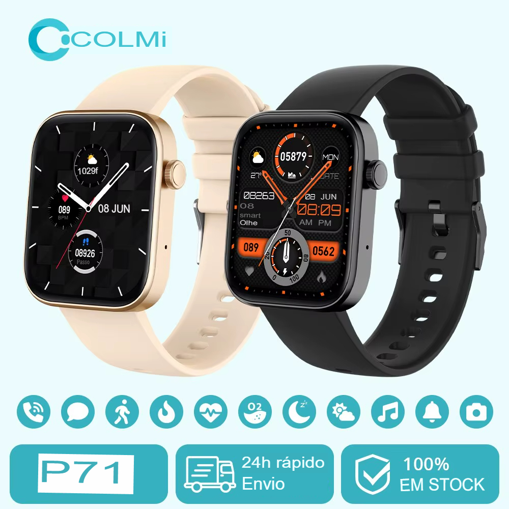 Colmi P71: O Rei do Valor em Smartwatch com Chamadas por Voz!Eleve sua vida com o Colmi P71 – o smartwatch acessível que une saúde, conectividade e aventura em um pulso fashion! Com tela vibrante de 1.9", bateria de 7 dias e IP68 à prova d'água, ele resiste ao seu ritmo acelerado. Compatível com todos os smartphones via app Pubu Wear, em +20 idiomas incluindo Português. Pronto para dominar o dia?Saúde Inteligente: Cuide de Si com Precisão!Monitore frequência cardíaca automática, oxigênio no sangue, pressão arterial e sono profundo – mais lembretes para beber água, se mover e rastrear ciclos femininos. Modo Zen e app de saúde para bem-estar total. Sinta-se invencível!Chamadas por Voz: Conectado Sem Limites!Atenda, disque e rejeite chamadas diretamente do pulso com discagem, contatos recentes e assistente de voz. Fique ligado ao mundo, sem tocar no celular – puro poder!Vida Diária: Facilidade que Impulsiona!Receba notificações inteligentes (chamadas, SMS, Gmail, apps), controle música/câmera, encontre seu telefone/relógio, use alarme, lanterna, cronômetro, calculadora e jogo. Modo "não perturbe" e ajuste de tela para dias sem interrupções. Simplifique e conquiste!Esportes: +100 Modos para Vitórias Épicas!Rastreie passos, calorias e distância com metas personalizadas e relatórios detalhados. De corrida a yoga, com alertas motivadores – transforme suor em resultados reais!O Colmi P71 não é só um relógio: é o seu aliado rei para saúde, conexões e performance. Invista no seu futuro agora – valor imbatível!