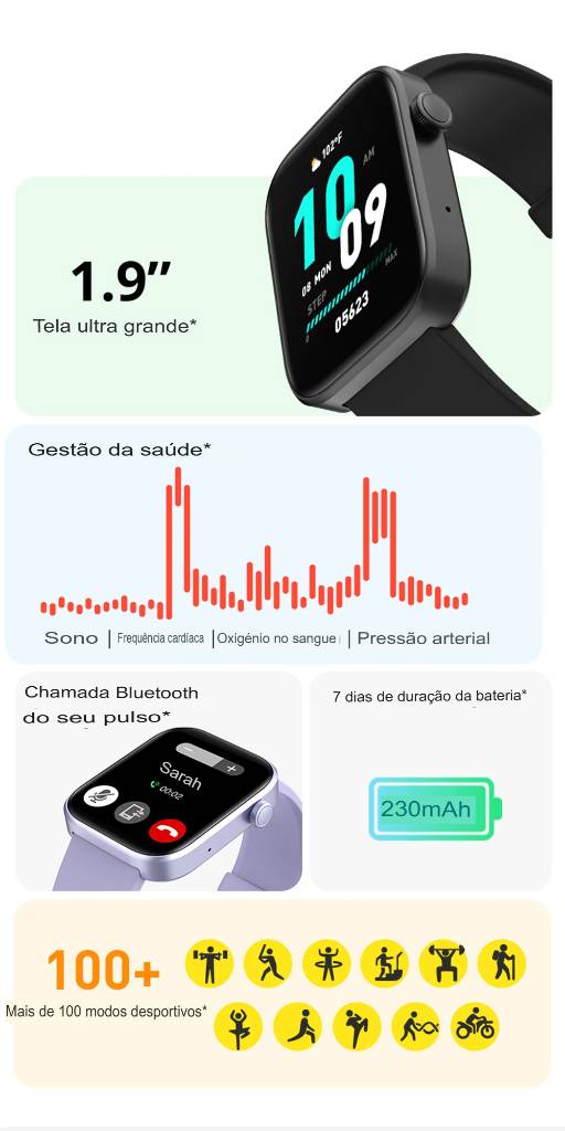- +100 Modos Esportivos: De corrida a yoga, com alertas motivadores para maximizar cada treino.
